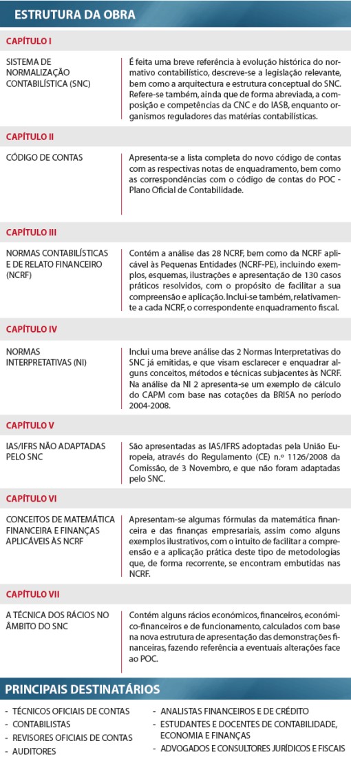 Na obra, são analisadas pormenorizadamente as Normas Contabilísticas e de Relato Financeiro (NCRF), que constituem o núcleo central do Sistema de Normalização Contabilística (SNC), partindo da envolvente teórica do normativo contabilístico, passando pela articulação com a fiscalidade, e culminando com a apresentação de exemplos, ilustrações e propostas de resolução de casos práticos, para a facilitar a compreensão das matérias e motivar os leitores para o grande interesse do relato financeiro como instrumento fundamental para a análise do desempenho e avaliação das empresas.